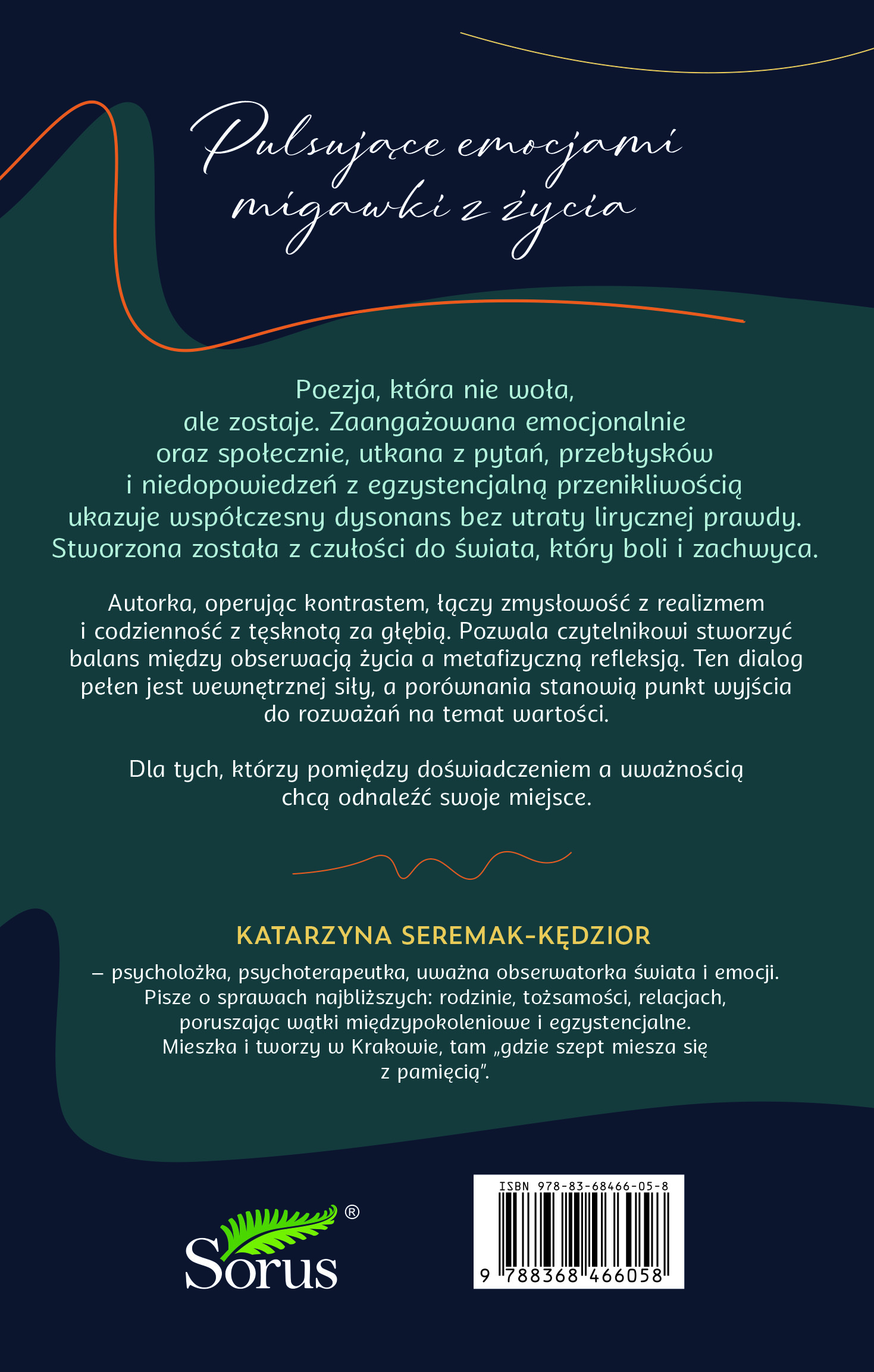 Katarzyna Seremak Kędzior – psycholożka, psychoterapeutka, uważna obserwatorka świata i emocji. Pisze o sprawach najbliższych: rodzinie, tożsamości, relacjach poruszając wątki międzypokoleniowe i egzystencjalne. Mieszka i tworzy w Krakowie, tam „gdzie szept miesza się z pamięcią”.