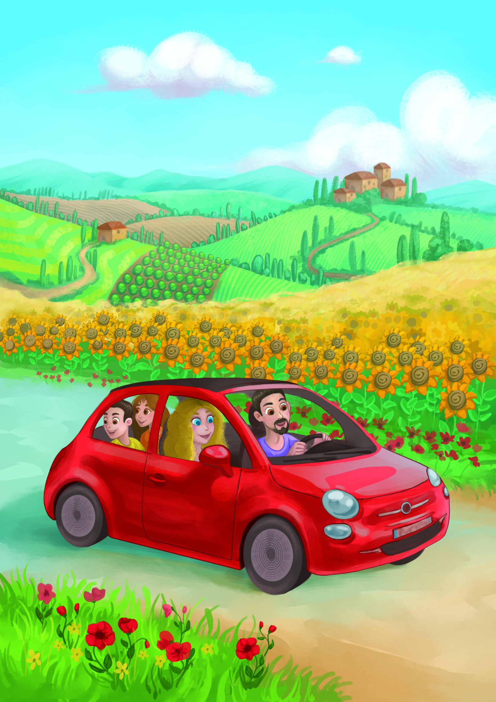 Jechaliśmy powoli, tak żeby zobaczyć jak najwięcej i podziwiać widoki. Spoglądałam z zainteresowaniem przez okno. Z daleka, już za zabytkami, dostrzegłam piękne krajobrazy. Pofalowane wzgórza rozdzielone były pięknymi łąkami i rozsypanymi jak klocki domkami. Zupełnie jak namalowany obraz. Jeszcze ta czerwień… Wytężyłam mocniej wzrok. „To chyba maki” – pomyślałam. Roślinność różniła się od naszej, polskiej. Warto było tu przyjechać. Nie