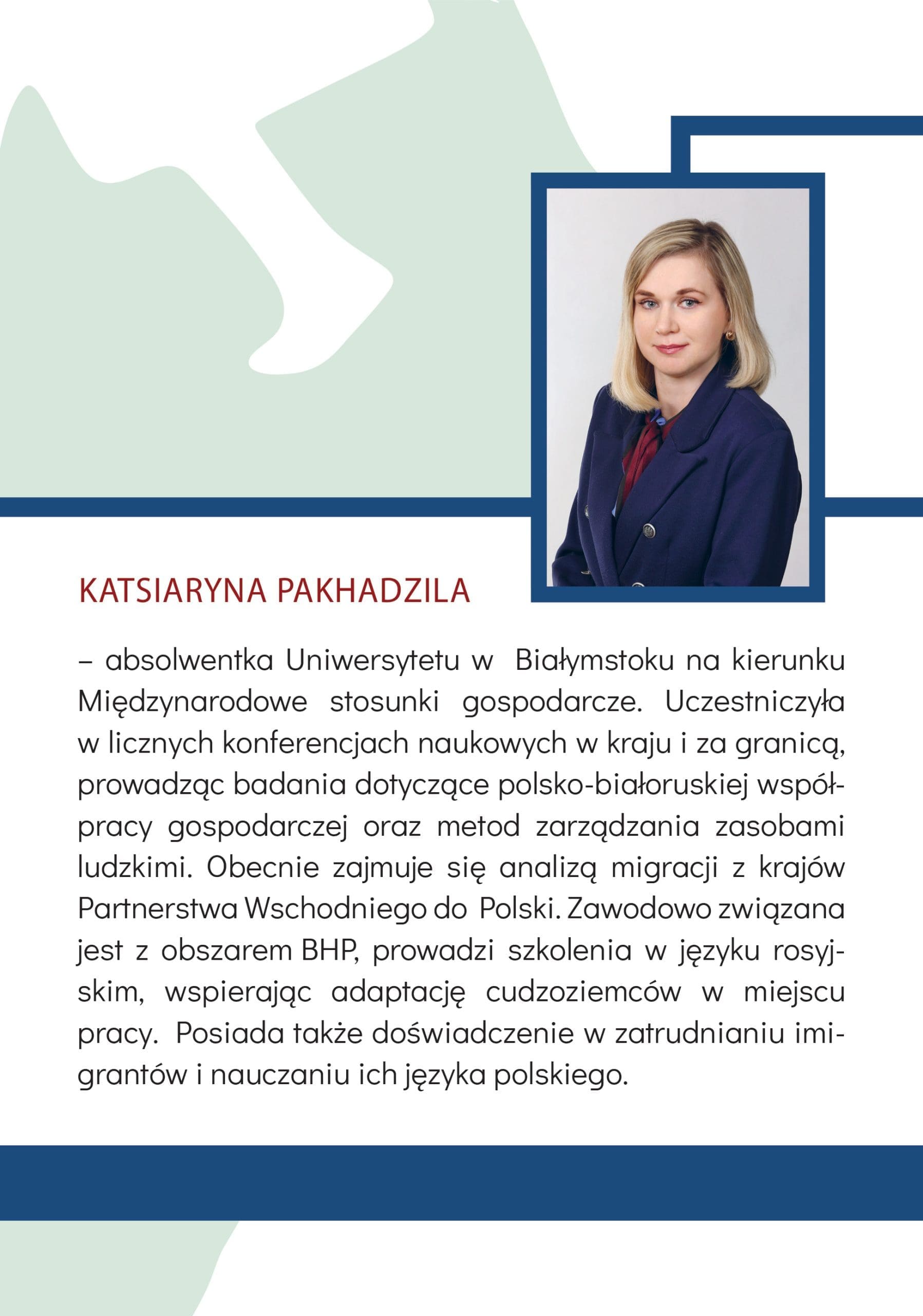 Katsiaryna Pakhadzila – absolwentka Uniwersytetu w Białymstoku na kierunku Międzynarodowe stosunki gospodarcze. Uczestniczyła w licznych konferencjach naukowych w kraju i za granicą, prowadząc badania dotyczące polsko-białoruskiej współpracy gospodarczej oraz metod zarządzania zasobami ludzkimi. Obecnie zajmuje się analizą migracji z krajów Partnerstwa Wschodniego do Polski. Zawodowo związana jest z obszarem BHP, prowadzi szkolenia w języku rosyjskim, wspierając adaptację cudzoziemców w miejscu pracy. Posiada także doświadczenie w zatrudnianiu imigrantów i nauczaniu ich języka polskiego.