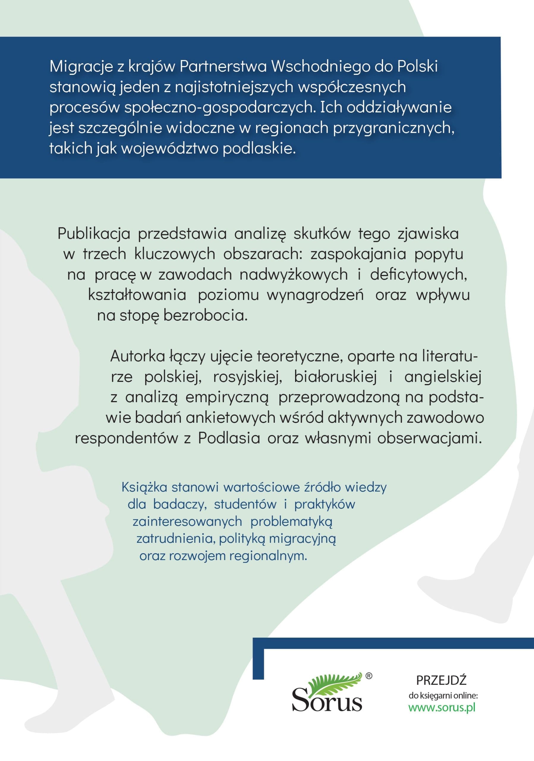 Migracje z krajów Partnerstwa Wschodniego do Polski stanowią jeden z najistotniejszych współczesnych procesów społeczno-gospodarczych. Ich oddziaływanie jest szczególnie widoczne w regionach przygranicznych, takich jak województwo podlaskie. Publikacja przedstawia analizę skutków tego zjawiska w trzech kluczowych obszarach: zaspokajania popytu na pracę w zawodach nadwyżkowych i deficytowych, kształtowania poziomu wynagrodzeń oraz wpływu na stopę bezrobocia. Autorka łączy ujęcie teoretyczne, oparte na literaturze polskiej, rosyjskiej, białoruskiej i angielskiej z analizą empiryczną przeprowadzoną na podstawie badań ankietowych wśród aktywnych zawodowo respondentów z Podlasia oraz własnymi obserwacjami. Książka stanowi wartościowe źródło wiedzy dla badaczy, studentów i praktyków zainteresowanych problematyką zatrudnienia, polityką migracyjną oraz rozwojem regionalnym.