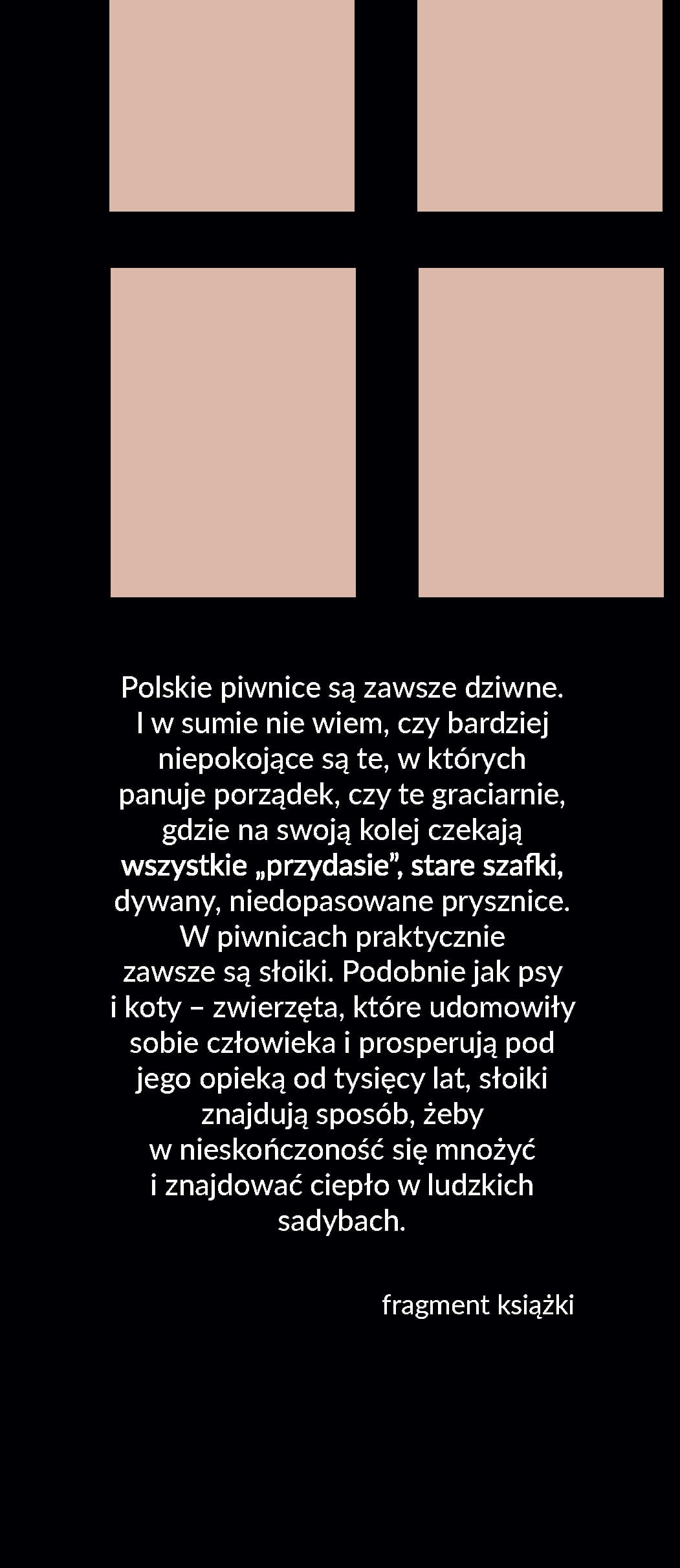 Polskie piwnice są zawsze dziwne. I w sumie nie wiem, czy bardziej niepokojące są te, w których panuje porządek, czy te graciarnie, gdzie na swoją kolej czekają wszystkie „przydasie”, stare szafki, dywany, niedopasowane prysznice. W piwnicach praktycznie zawsze są słoiki. Podobnie jak psy i koty – zwierzęta, które udomowiły sobie człowieka i prosperują pod jego opieką od tysięcy lat – słoiki znajdują sposób, żeby w nieskończoność się mnożyć i znajdować ciepło w ludzkich sadybach. Może przez chwilę wydawało się, że populacja słoików się zmniejszy: niby społeczeństwo się bogaciło, wszędzie powstawały nowe knajpy. Ale słoiki przetrwały.