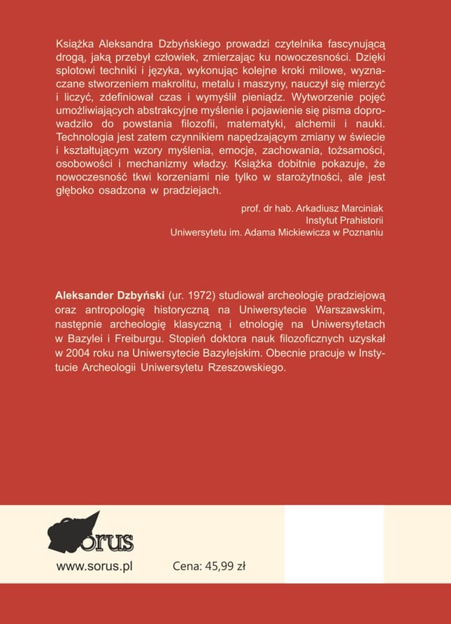 Książka Aleksandra Dzbyńskiego prowadzi czytelnika fascynującą drogą, jaką przebył człowiek, zmierzając ku nowoczesności. Dzięki splotowi techniki i języka, wykonując kolejne kroki milowe, wyznaczane stworzeniem makrolitu, metalu i maszyny, nauczył się mierzyć i liczyć, zdefiniował czas i wymyślił pieniądz.
