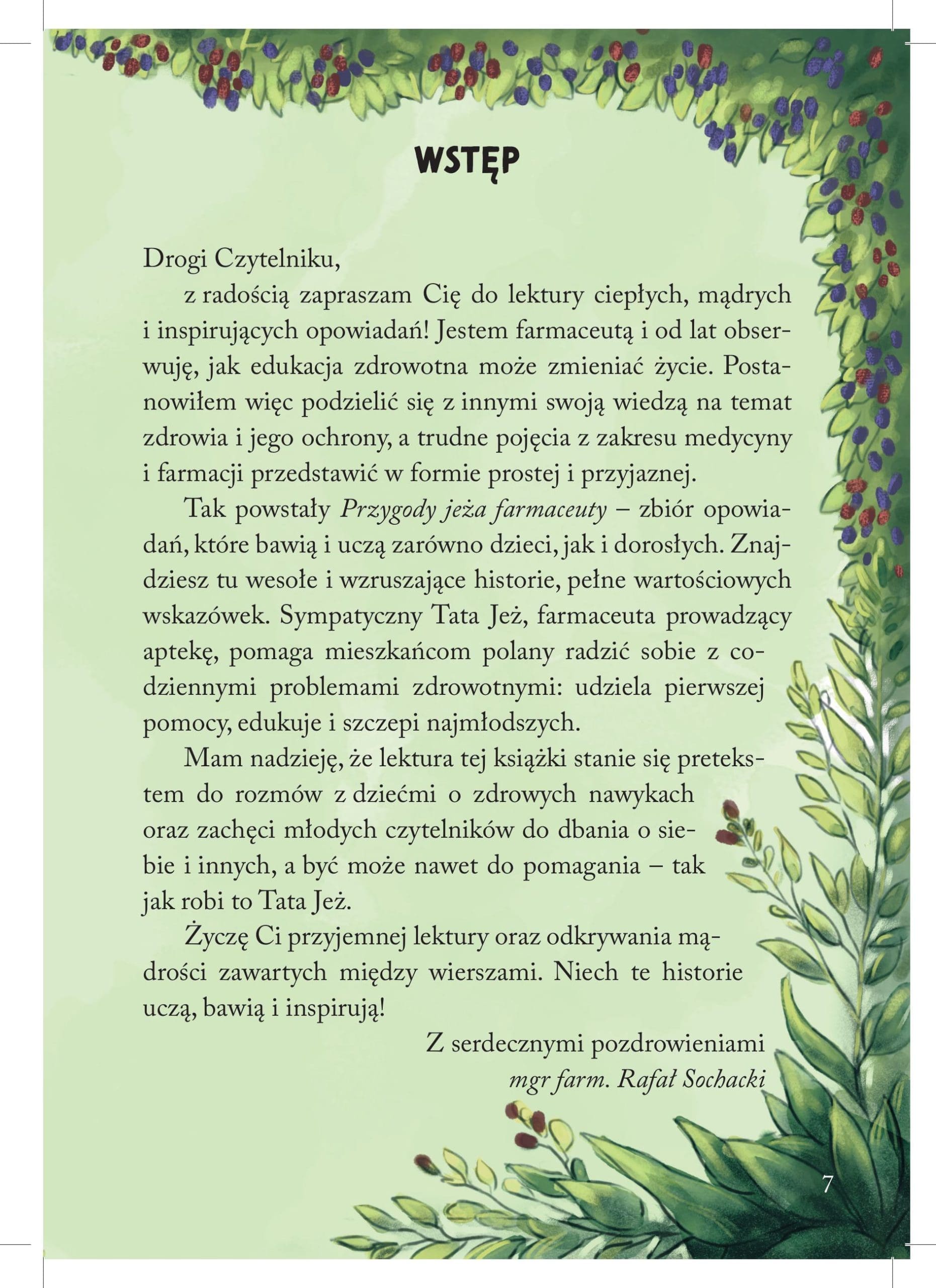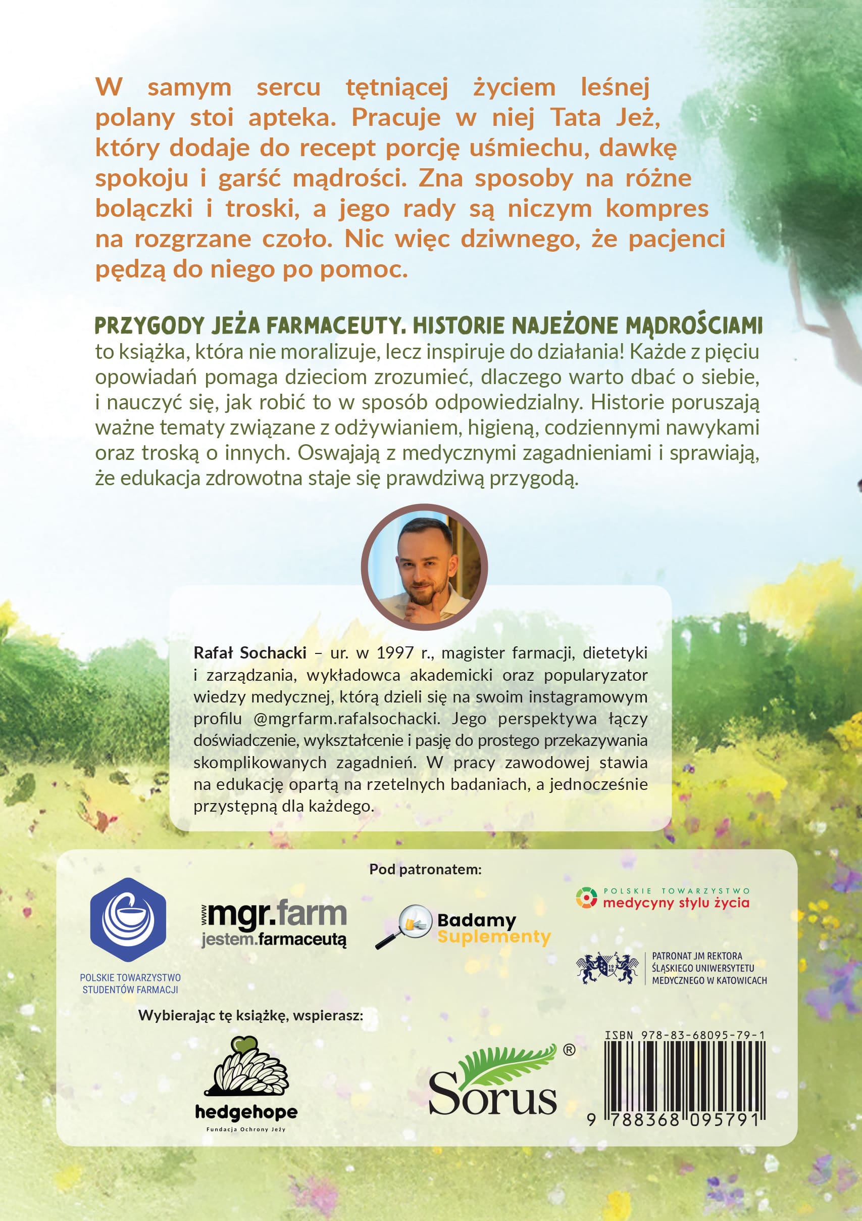 „Przygody jeża farmaceuty. Historie najeżone mądrościami” to książka, która nie moralizuje, lecz inspiruje do działania! Każde z pięciu opowiadań pomaga dzieciom zrozumieć, dlaczego warto dbać o siebie, i nauczyć się, jak robić to w sposób odpowiedzialny. Historie poruszają ważne tematy związane z odżywianiem, higieną, codziennymi nawykami oraz troską o innych. Oswajają z medycznymi zagadnieniami i sprawiają, że edukacja zdrowotna staje się prawdziwą przygodą.