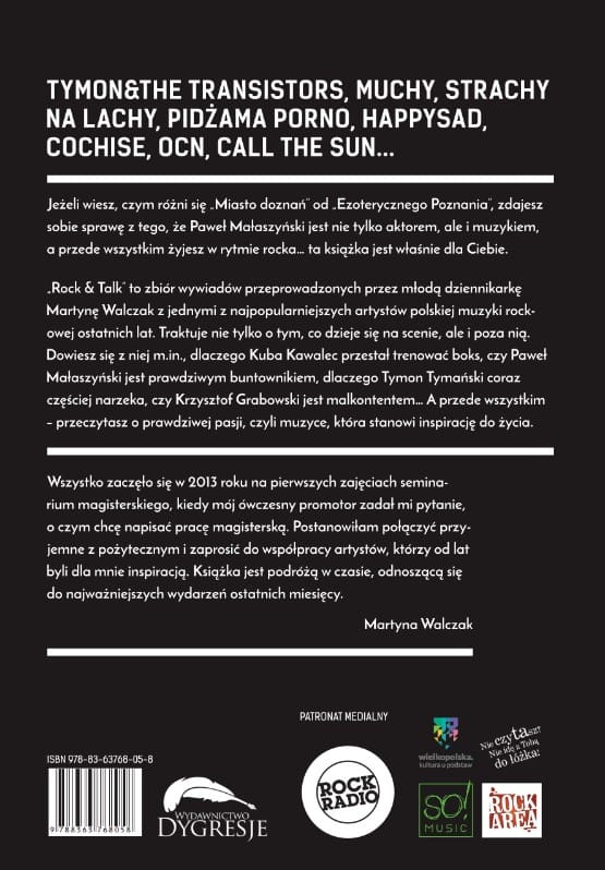 „Rock & Talk” to zbiór wywiadów przeprowadzonych przez młodą dziennikarkę, Martynę Walczak, z jednymi z najpopularniejszych artystów polskiej muzyki rockowej ostatnich lat. Traktuje nie tylko o tym, co dzieje się na scenie, ale i poza nią. Dowiesz się z niej m.in., dlaczego Kuba Kawalec przestał trenować boks, czy Paweł Małaszyński jest prawdziwym buntownikiem, dlaczego Tymon Tymański coraz częściej narzeka, czy Krzysztof Grabowski jest malkontentem… A przede wszystkim – przeczytasz o prawdziwej pasji, czyli muzyce, która stanowi inspirację do życia.
