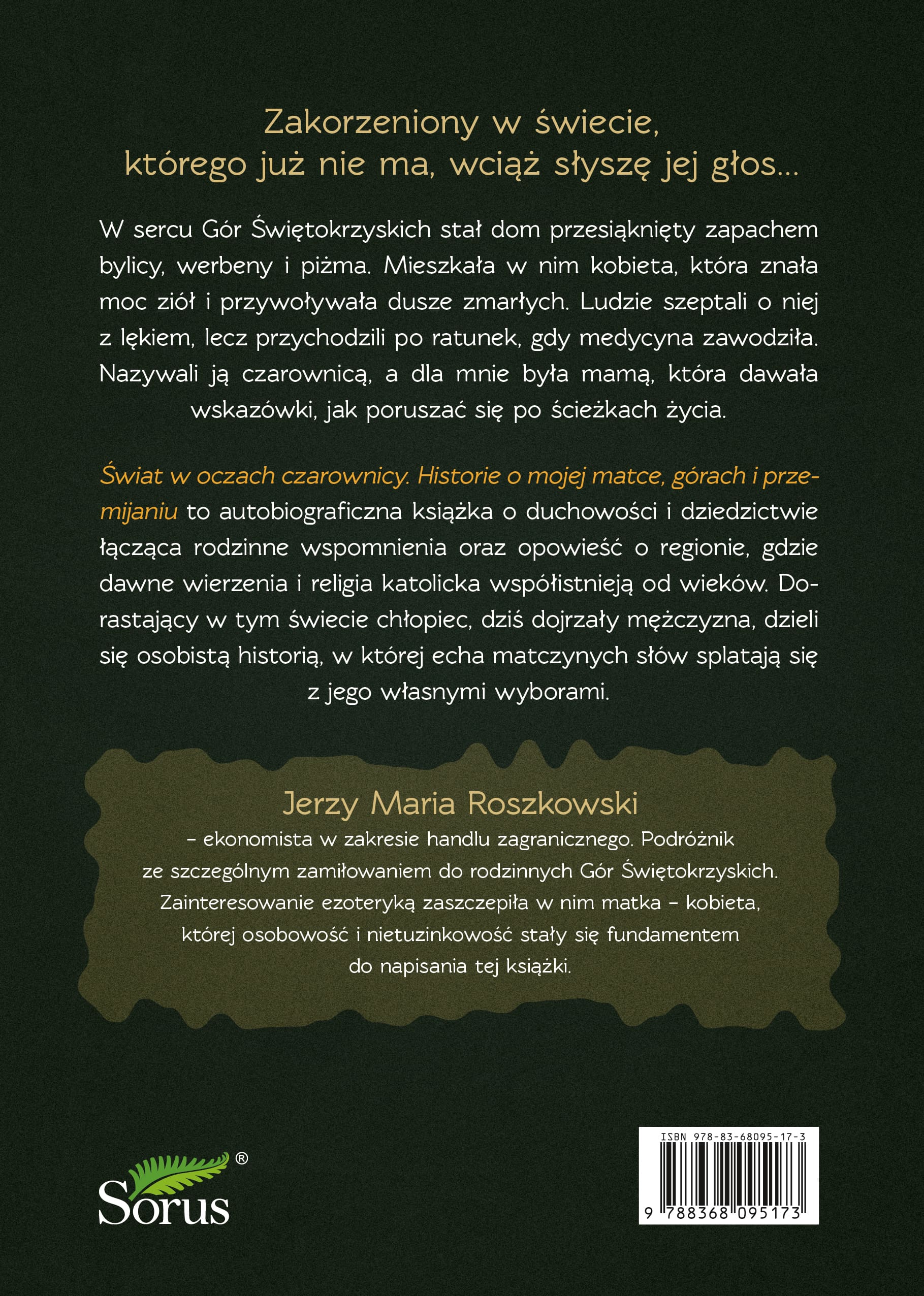 ” Świat w oczach czarownicy. Historia o mojej matce, górach, przemijaniu” to bardzo subiektywna, osobista historia, która oczami małego chłopca opowiada o wielu istotnych rzeczach, o życiu, matce, uczuciach. Matka – dla dziecka to cały świat, oparcie, skała, na której uczy się budować własne życie. To ona uczy go świata, pełnego chaosu, obcego, którego nie zna i nie rozumie. Dzięki matce chłopiec odkrywa świat trudnych decyzji i wyborów, codziennych małych gestów, ziołolecznictwa, które leczy duszę i ciało. Matka to autorytet, który wie o świecie więcej, niż inni, to również uzdrowicielka o wielkiej mocy serca i umysłu. Chłopiec uczy się budować swój świat, niekiedy nieidealny, ale z poczuciem własnej wartości, a jednocześnie z poczuciem, że nic nie jest trwałe.