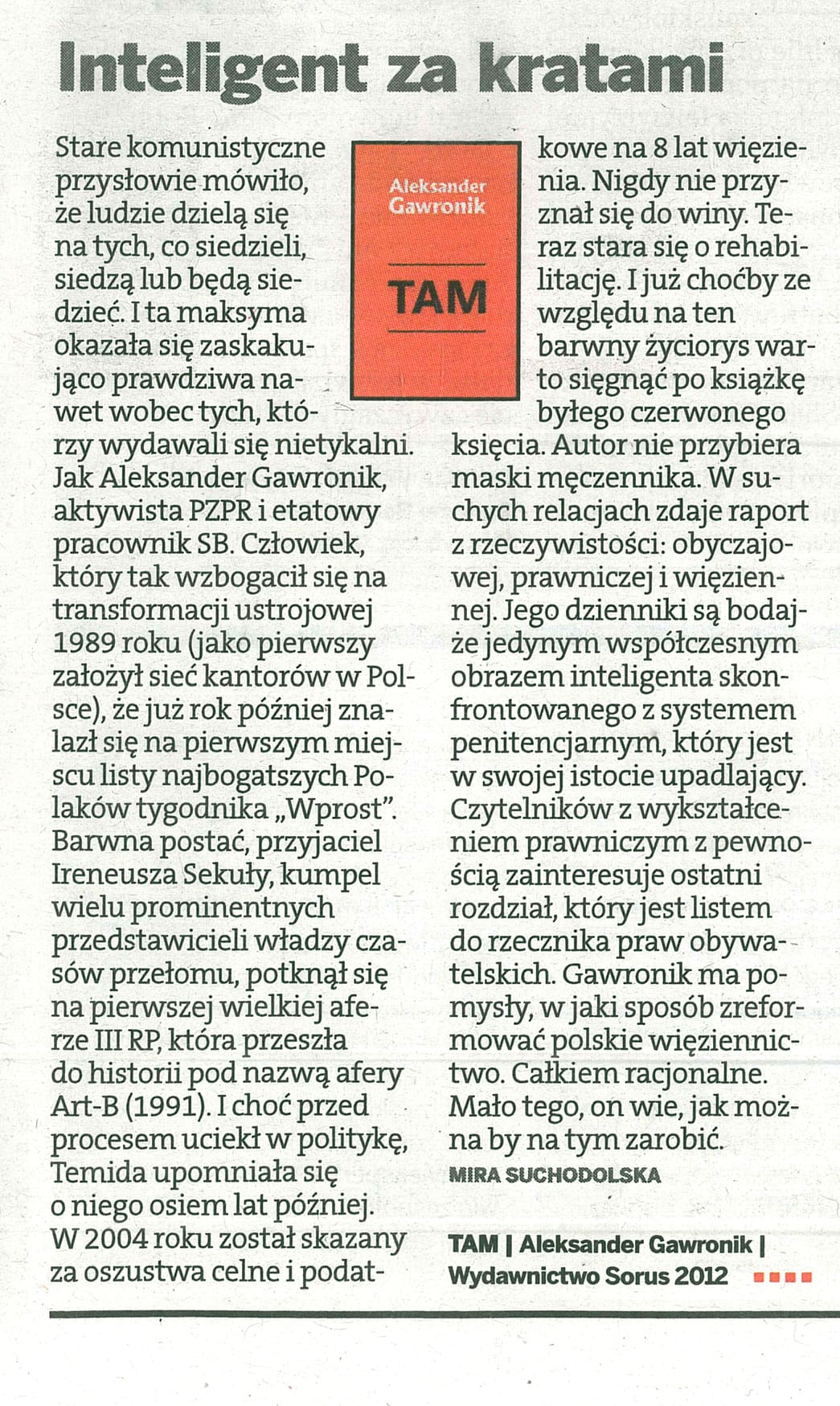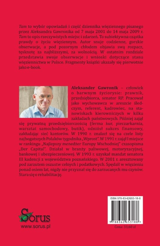 „Tam” to wybór opowiadań i część dziennika więziennego pisanego przez Aleksandra Gawronika od 7 maja 2001 do 14 maja 2009 r. Tam to opis rzeczywistych miejsc i zdarzeń. To subiektywna cząstka prawdy o życiu więziennym. Autor snuje codzienne, gorzkie obserwacje, a pod pozornym chłodem objawia swą rozpacz, tęsknotę za najbliższymi, za wolnością. W ostatnim rozdziale przedstawia swoje obserwacje i wnioski dotyczące stanu więziennictwa w Polsce. Fragmenty książki ukazały się pierwotnie jako e-book.
