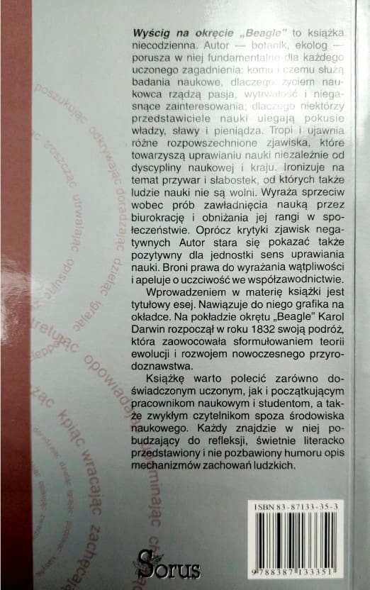 Wyścig na okręcie Beagle. to książka niecodzienna. Autor – botanik, ekolog – porusza w niej fundamentalne dla każdego uczonego zagadnienia: komu i czemu służą badania naukowe, dlaczego życiem naukowca rządzą pasja, wytrwałość i niegasnące zainteresowania; dlaczego niektórzy przedstawiciele nauki ulegają pokusie władzy, sławy i pieniądza. Tropi i ujawnia różne rozpowszechnione zjawiska, które towarzyszą uprawianiu nauki niezależnie od dyscypliny naukowej i kraju. Ironizuje na temat przywar i słabostek, od których także ludzie nauki nie są wolni. Wyraża sprzeciw wobec prób zawładnięcia nauką przez biurokrację i obniżania jej rangi w społeczeństwie. Oprócz krytyki zjawisk negatywnych Autor stara się pokazać także pozytywny dla jednostki sens uprawiania nauki. Broni prawa do wyrażania wątpliwości i apeluje o uczciwość we współzawodnictwie.