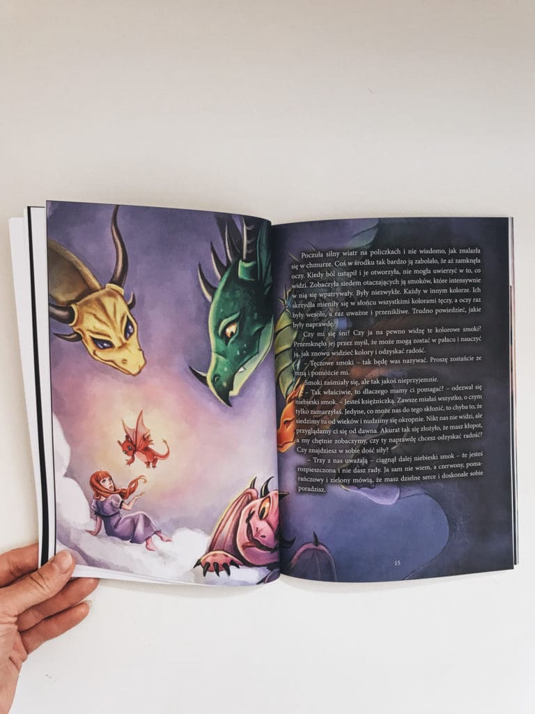 Bajka Księżniczka i tęczowe smoki dotyka ważnego i coraz częstszego problemu, jakim jest depresja u dziecka. W przypadku głównej bohaterki symbolizuje ją utrata postrzegania kolorów. Rodzice, zajęci pracą, nie są w stanie pomóc córce, a co więcej, nie dostrzegają choroby. Dziewczynka nie poddaje się i sama szuka sposobu powrotu do zdrowia. Spotyka siedem smoków nakazujących jej odszukanie magicznych kamieni, które pomogą znowu zobaczyć kolory.
