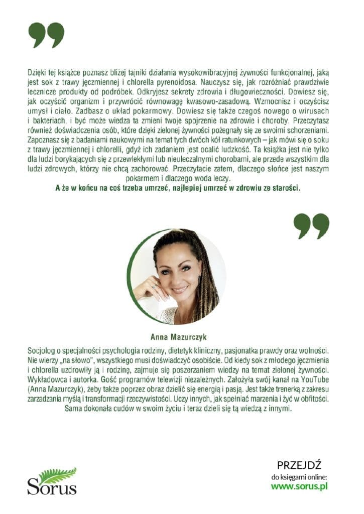 Ta wyjątkowa książka przybliża tajniki działania wysokowibracyjnej żywności funkcjonalnej, takiej jak: sok z trawy jęczmiennej i chlorella pyrenoidosa. Uczy jak rozróżniać prawdziwie lecznicze produkty od podróbek. Pozwala odkryć sekrety zdrowia i długowieczności. Pokazuje jak oczyścić organizm i przywrócić równowagę kwasowo–zasadową.